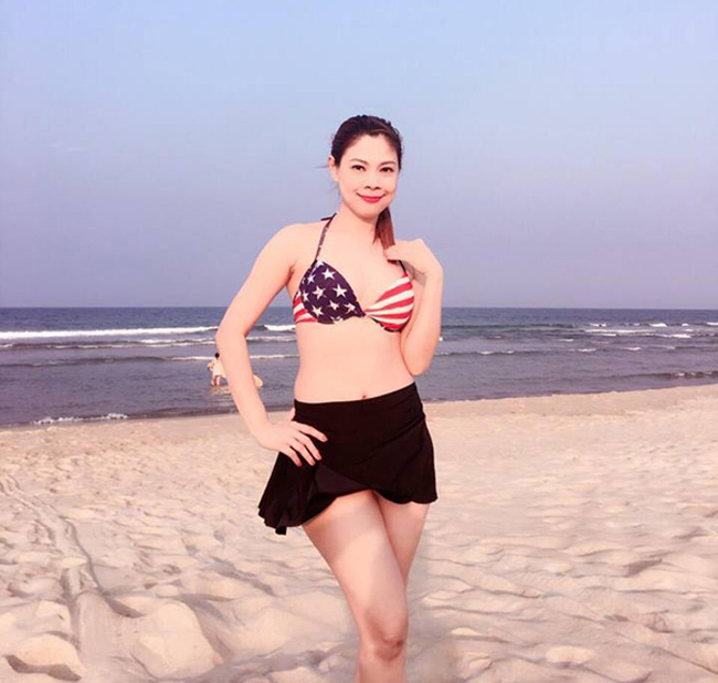 Dù đã là gái một con, nhưng mỗi khi ra bãi biển, cô không ngại diện những trang phục có màu sắc nổi bật, bắt mắt.