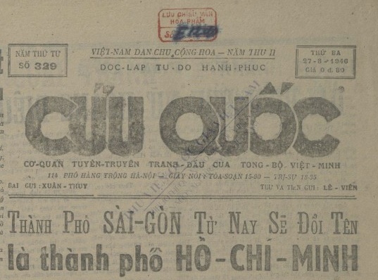 Ngày 27/8/1946, trên trang nhất báo Cứu Quốc chạy tít lớn: “Thành phố Sài-Gòn từ nay sẽ đổi tên là Thành phố Hồ-Chí-Minh”. Một lời khẳng định.
