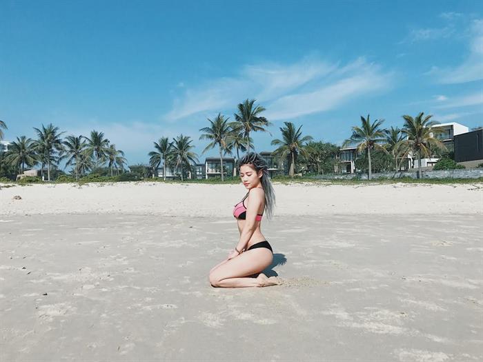 Trước đó, trong chuyến đi du lịch ở Đà Nẵng, cô nàng cũng "đốt mắt" người hâm mộ khi chia sẻ những hình ảnh mặc bikini chụp hình trong hồ bơi ướt sũng.