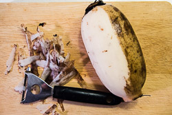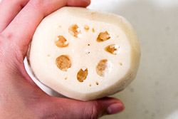 Cẩn thận rửa sạch ngó sen. Nạo bỏ phần vỏ. Khi cắt phần cuộng cứng thừa ở 2 đầu ngó sen, chú ý không cắt quá sâu vào phần thịt của ngó sen làm lộ phần lỗ bên trong.
