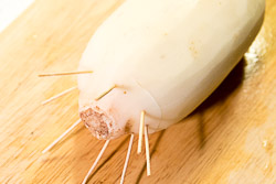 Đậy phần “nắp” được cắt ra lúc trước vào đúng vị trí cũ, khi nấu lên, gạo bên trong ngó sen sẽ nở ra và lấp vào các lỗ ở phần “nắp” Dùng 6-8 cái tăm để ghim cố định hai phần này với nhau. Chú ý xỏ tăm vào càng sâu càng tốt vì khi nấu, gạo nở bung có thể khiến phần “nắp” rời ra nếu tăm giữ không đủ chặt.