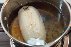 Khi nước sôi và đường tan hết, giảm xuống lửa vừa, đậy nắp và tiếp tục đun trong 1 giờ. Lật ngó sen sau mỗi 30 phút và thêm nước nếu cần thiết. Giảm lửa xuống mức nhỏ nhất và để sôi lăn tăn thêm 20 phút nữa. Lật ngó sen 4-5 lần trong khi nấu.