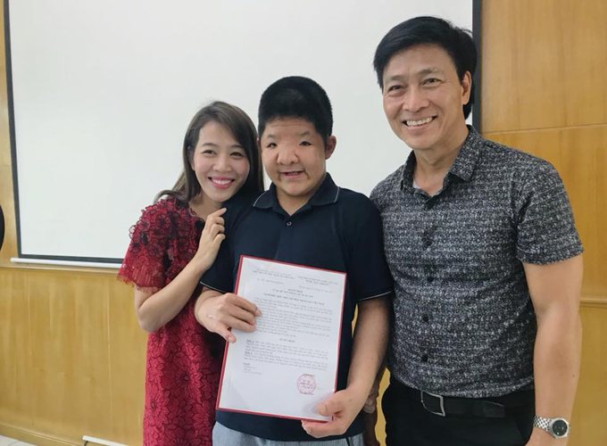 Quốc Tuấn đã cố ngăn nước mắt xúc động khi chứng kiến giây phút con trai nhận học bổng. Anh gửi lời cám ơn đến ban giám hiệu Học viện Âm nhạc Quốc gia Việt Nam. "Có lẽ các thầy không cảm nhận được món quà này có ý nghĩa lớn thế nào, đặc biệt là đối với hoàn cảnh của Bôm. Phải ở trong hoàn cảnh này mới thấy nó to lớn và là động lực để giúp Bôm phát triển như một đứa trẻ bình thường", anh chia sẻ.