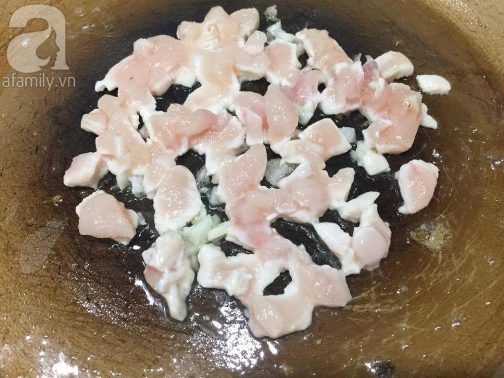 Tỏi, gừng, đầu hành băm nhỏ. Cho 2 thìa canh dầu ăn lên chảo nóng, cho tỏi, gừng, đầu hành vào xào cho thơm, dậy mùi. Trút thịt gà vào chảo xào đều, nêm ½ thìa hạt nêm, ½ thìa café đường.