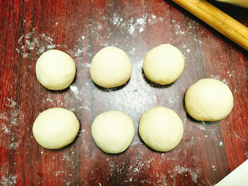 Lấy khối bột ra bàn sạch, rắc chút bột khô lên bàn rồi ấn xẹp miếng bột, chia thành 7-8 miếng bột đều nhau rồi làm tròn từng miếng bột, đậy kín để bột nghỉ 10 phút.