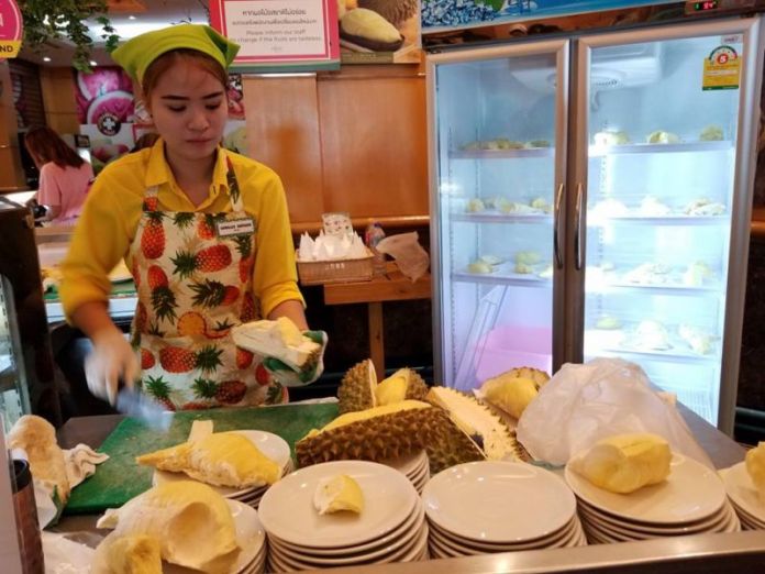 Trái cây Thái Lan được trưng bày trước nhà hàng buffet sầu riêng (H́nh: Ngọc Lan/Người Việt)