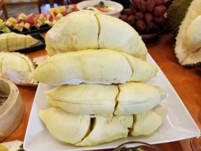 Sầu riêng cơm trắng tại "buffet sầu riêng" ở Bangkok Tháng Năm, 2018 (H́nh: Ngọc Lan/Người Việt)