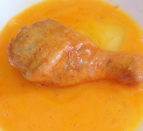 - Cho miếng gà đã lắc với hỗn hợp bột bên trên nhúng qua trứng, rồi lăn qua bột chiên xù.