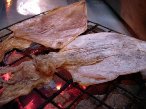 - Bước 1: Mực khô các bạn có thể nướng bằng cồn hoặc lò vi sóng, lò nướng, nhưng nướng bằng cồn có lẽ sẽ đem lại hương vị thơm ngon nhất. Nhưng để món mực nướng thơm ngon thì các bạn nên tách rời phần thân và đầu mực nướng riêng, vì phần đầu sẽ cần thời gian chín lâu hơn, nếu nướng cùng phần thân mực sẽ làm phần thân mực dễ bị cháy và khô cứng. Mực sau khi nướng xong, các bạn gói lại bằng giấy báo rồi dùng dày chày giã nhẹ (mục đích là để mực được mềm và rơi hết vụn đen bám dính vào thân mực).