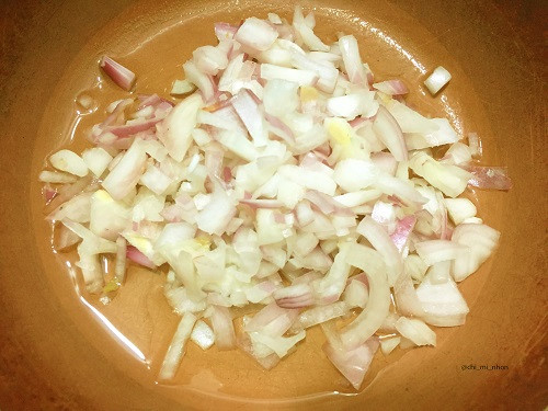 Sơ chế nước sốt: Bóc sạch vỏ hành và rửa với nước sạch. Cho hành khô vừa rửa thái nhỏ phi vàng cùng 1 thìa cà phê dầu ăn và 1/2 thìa bơ. Sau đó bạn cho 2 thìa cà phê tương ớt, 1/2 thìa cà phê đường, 1/2 thìa cà phê bột nêm cùng 2 thìa cà phê nước đun sôi. Phần sốt mỡ hành cần quấy đều trên lửa nhỏ cho đến khi nước sốt trở nên cô đặc và sánh lại.