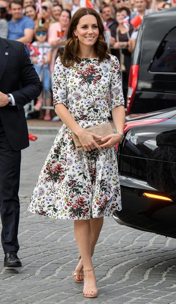 Những trang phục in hoa luôn là lựa chọn hàng đầu của Công nương Kate. Cô diện thiết kế lấy màu xanh làm chủ đạo cùng chi tiết thắt nơ nữ tính khi đến thăm khu vườn Diana Memorial. Mẫu váy của Prada có giá hơn 51 triệu đồng.