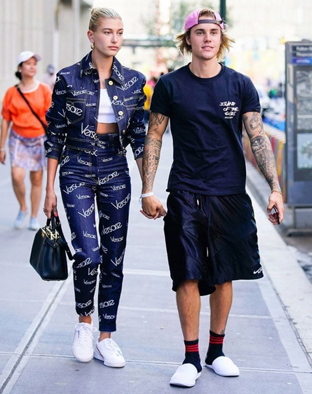Justin chọn áo phông cùng quần thể thao, trong khi bạn gái anh diện bộ denim của Versace, kết hợp túi xách cổ điển. Cả hai cùng kết hợp sắc xanh tím than và sneakers trắng.