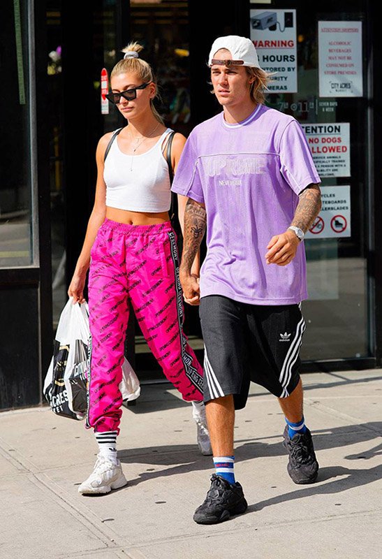 Cả hai thường xuyên xuất hiện tại New York. Justin mặc một chiếc áo phông Adidas màu trắng và quần soóc camo xanh lục, vợ chưa cưới của anh kết hợp chiếc váy ôm sát in hoạ tiết cùng áo khoác denim rộng khá ăn ý.