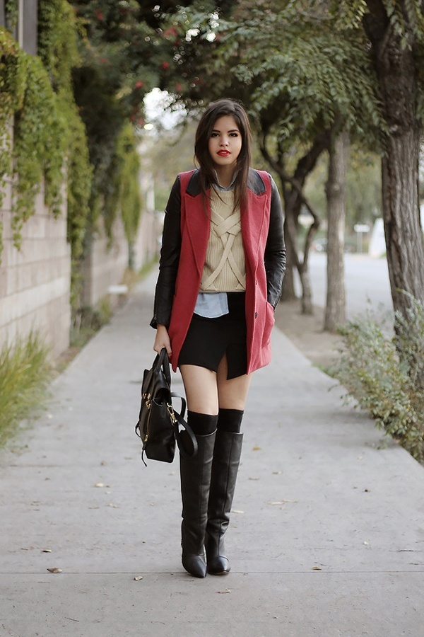 Đây là công thức mix đồ đang được các cô nàng châu Á áp dụng nhiều nhất. Set đồ đơn giản với chân váy ngắn và thêm một đôi boots cao cổ là bạn đã có được tổng thể gọn gàng, lịch sự lại đủ ấm áp và thời trang. Đặc biệt set đồ này có thể diện đi làm hay đi chơi đều ổn cả.