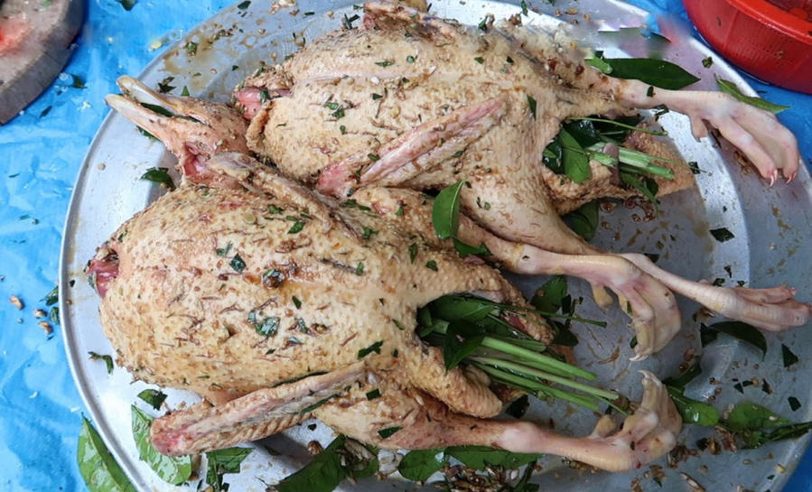 Công đoạn 1: Ướp vịt với gia vị và lá móc mật