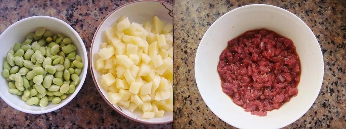 Hạt đậu nành rửa sạch; khoai tây gọt vỏ thái khối nhỏ như đậu nành. Thịt bò rửa sạch thái hạt lựu nhỏ. Cho thịt bò vào bát, thêm chút nước tương, rượu nấu ăn, muối vào trộn đều và ướp khoảng 10 phút.