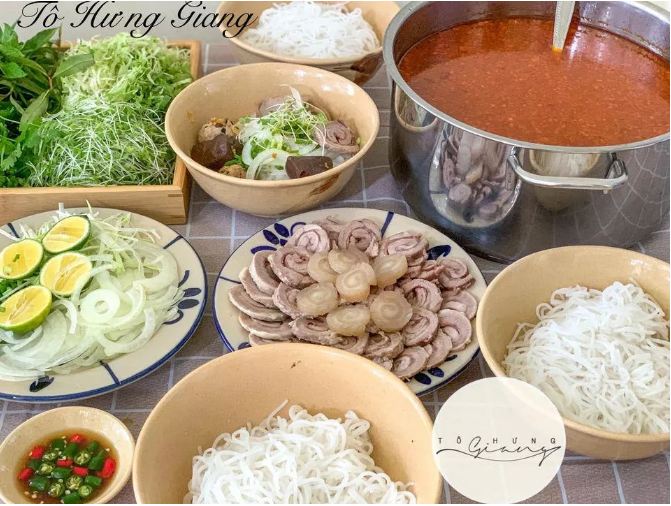 - Khi ăn xếp bún ra bát to, phần thịt, móng giò, tiết, mọc… thêm chút hành thái nhỏ, hành tây bào mỏng, chan nước lèo và ăn cùng ớt rim, nước mắm ớt, vắt chanh, ăn kèm các loại rau sống.