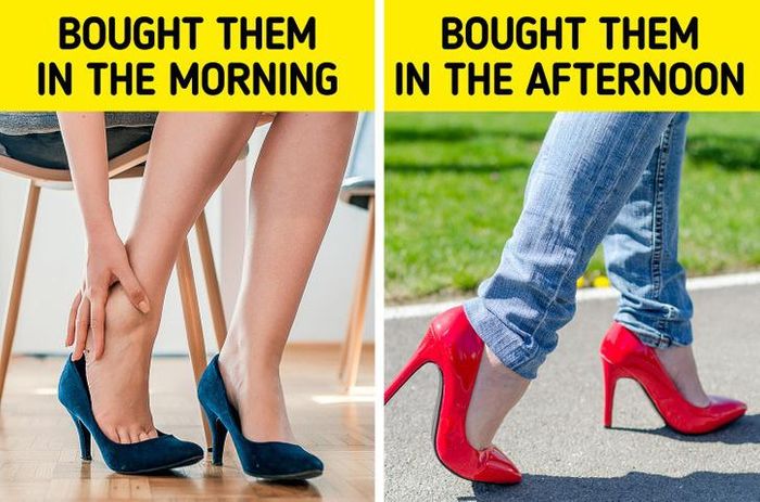 Việc vận động đi lại suốt cả ngày thường khiến bàn chân to ra hơn một chút. Vì vậy, mua giày vào buổi sáng – khoảng thời gian chưa vận động nhiều, chân còn nhỏ có thể sẽ làm bạn mua một đôi giày chật hơn mong muốn.