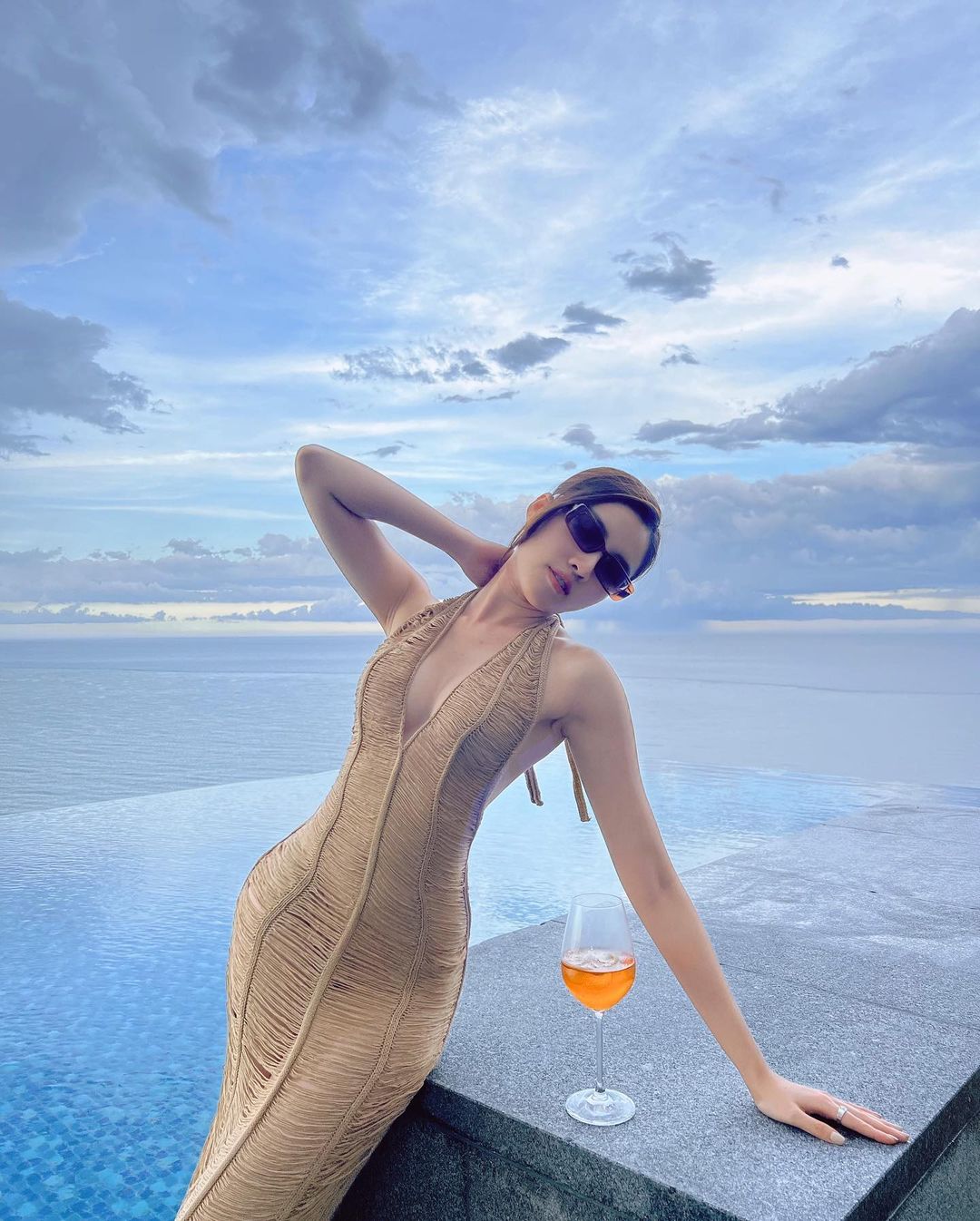 Hoa hậu Lương Thùy Linh cũng không đứng ngoài xu hướng trên. Người đẹp Cao Bằng chọn chiếc váy dài co giãn có gam màu thiên về tone be, kem.