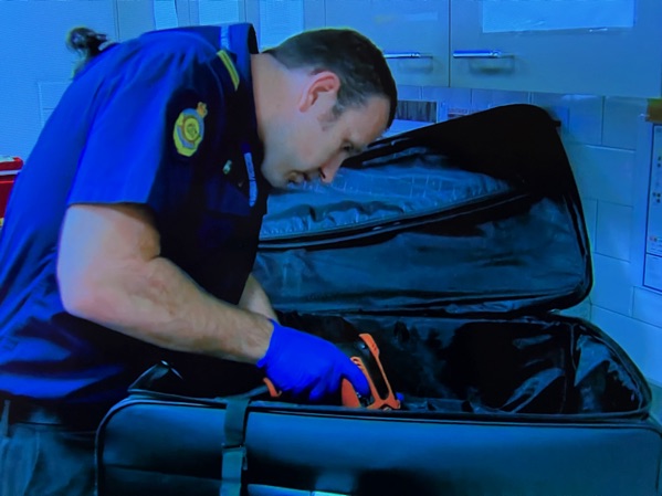 Hải quan đã khoan thẳng vào vali sau khi máy scan cho thấy có điều bất ổn. Đó là khối màu xanh bất thường trong vali, đây là màu báo hiệu ma tuý.