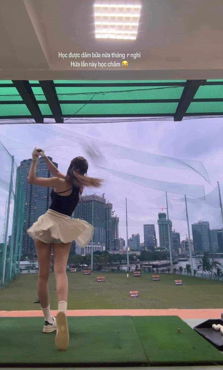 Bên cạnh đam mê tập gym, Thiều Bảo Trâm mới đây còn gia nhập bộ môn của giới siêu giàu - chơi gofl khi cập nhật trên story trang cá nhân hình ảnh đi học đánh golf ở sân tập. Nữ ca sĩ diện áo ba lỗ ôm sát cơ thể và chân váy tennis siêu ngắn, vừa giúp cô khoe được thân hình gợi cảm lại vừa mang lại diện mạo dễ thương.