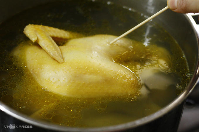 Chú ý, khi cho gà vào chờ nước sôi trở lại thì hạ lửa nhỏ lăn tăn, đậy kín vung luộc 5 - 6 phút. Sau đó, tắt bếp và đậy vung om gà 25-30 phút để gà ngậm nước chín đều từ từ, không bị đỏ xương, không bị rách da. Việc luộc ở lửa nhỏ, om gà cũng giúp protein, axit amin không bị phân hủy thịt ngọt mọng hơn. Khi luộc thêm chút muối hạt, gừng, hành cho thơm thịt.