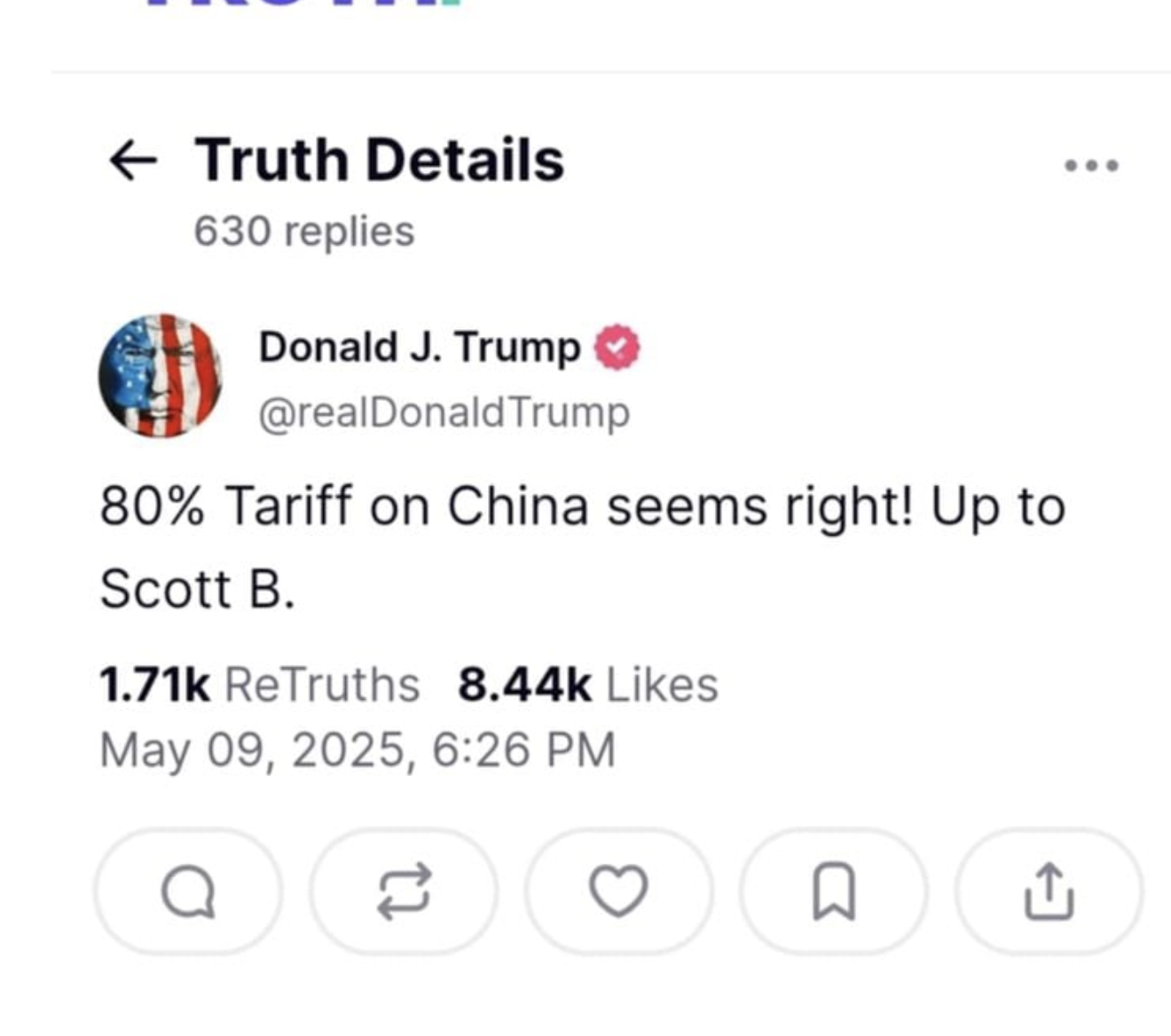 “ Thuế quan 80% đối với Trung Quốc có vẻ đúng! Tùy thuộc vào Scott B”, Tổng thống Trump viết trong một bài đăng trên Truth Social. Bộ trưởng Tài chính Scott Bessent là một trong những thành viên đàm phán với người đồng cấp từ Trung Quốc tại các cuộc họp ở Thụy Sĩ vào cuối tuần này.