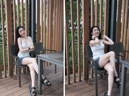 Chuyển sang khung hình tại một quán cafe, hot girl Sơn Tây gây sốt với outfit đời thường đơn giản nhưng bắt mắt: áo hai dây trắng mix cùng quần short jeans cạp cao, khoe trọn đôi chân dài thẳng tắp. Đôi sandal đế bệt giúp tổng thể thêm phần trẻ trung, năng động, còn chiếc đồng hồ thông minh đeo tay lại thể hiện nét cá tính hiện đại. Chu Thanh Huyền xuất hiện với gương mặt xinh đẹp, makeup tối giản nhưng khí chất vẫn cuốn hút. Đặc biệt, là dàn da "trắng phát sáng", thần thái tự tin và nụ cười tươi tắn của Chu Thanh Huyền càng khiến netizen thêm phần mê mẩn – ngọt ngào lại dễ gần.