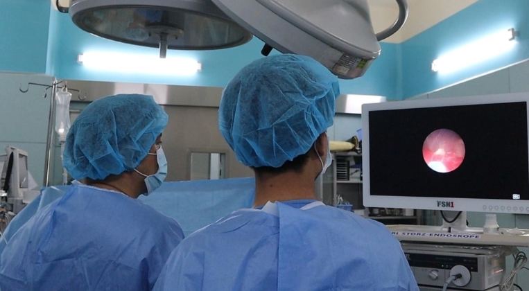 Bác sĩ nội soi tán sỏi thận qua da tại Bệnh viện Bình Dân. Ảnh: Trần Nhung
