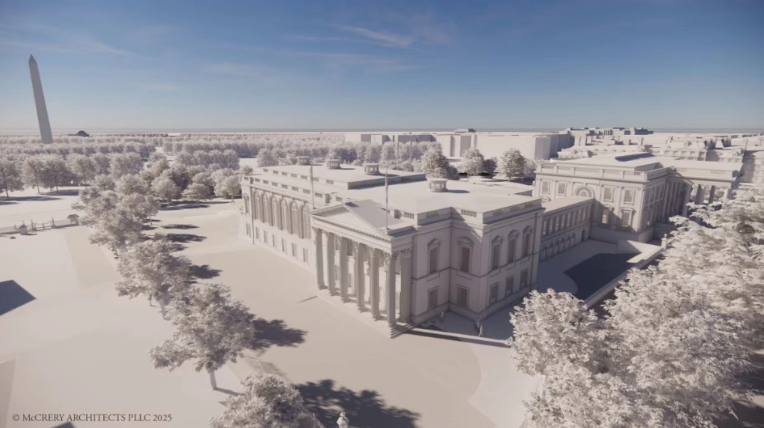 Giới chức Mỹ cũng công bố một bản phác thảo về phòng khiêu vũ, cho thấy đây sẽ là tòa nhà màu trắng với các cột lớn và mặt tiền giống như tòa chính của Nhà Trắng. Công trình sẽ thay thế Cánh Đông, nơi vốn là văn phòng của đệ nhất phu nhân Mỹ.