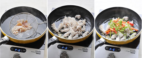 3. 3 Chần mực thật nhanh qua nước sôi rồi vớt ra.