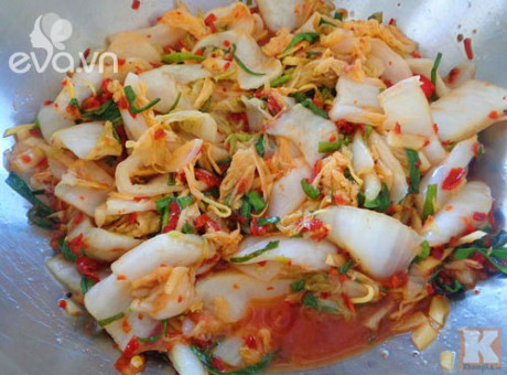 Bước 2: Giấm, đường, nước mắm, hẹ, tỏi, hành và gừng trộn chung trong một âu. Sau đó cho cải thảo vào trộn đều. Cho tất cả vào hũ đậy nắp kín, cất trong ngăn mát tủ lạnh 1 ngày là có thể ăn ngon.