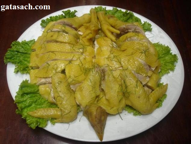 Tới khi gà chín bạn nhấc gà ra khỏi nồi, đem bột nghệ quét lên trên mình gà và chặt miếng vừa ăn. Bày thịt gà ra đĩa và rắc lên lá chanh thái sợi, ớt tỉa hoa. Món thịt gà đã xong, tới lượt làm phần gia vị chấm cũng không thể thiếu, bạn cho 1 chút muối ra đĩa nhỏ, thêm chút tiêu, vài sợi lá chanh, chút ớt cắt lát và vắt chanh nhé.