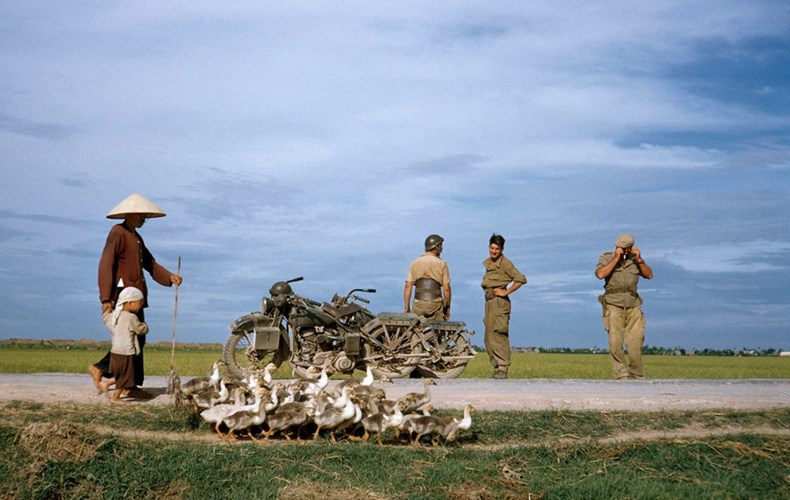 Cụ bà và đứa cháu lùa đàn vịt qua một nhóm quân Pháp trên đường từ Nam Định đi Thái Bình.