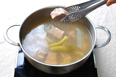 Sau khi ninh thịt bò nhừ, lượng nước trong nồi còn khoảng 1/3 thì lấy thịt bò ra.