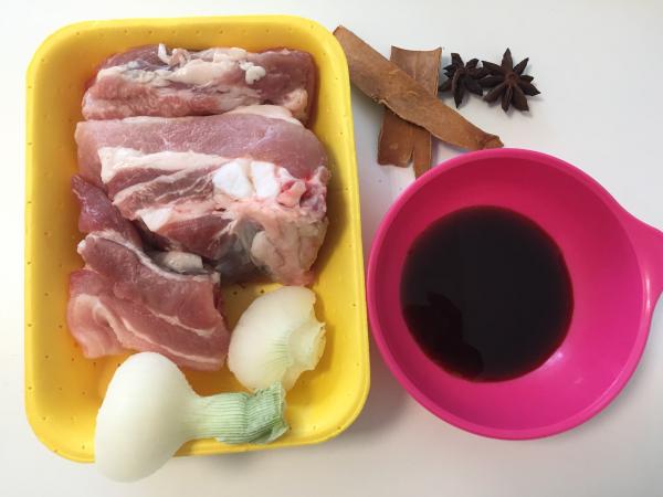 Thịt heo rửa sạch, hành đập dập. Cho thịt heo, nước tương, hành, quế hồi vào nồi, ướp thịt trong 15 phút cho phần nước tương thấm vào thịt.
