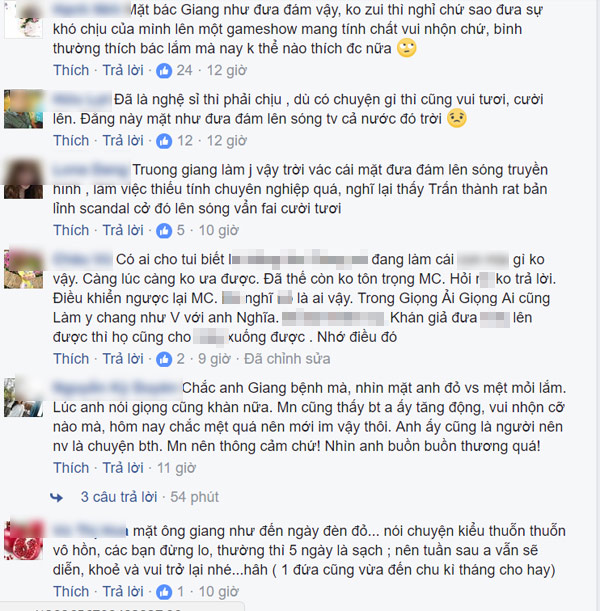 'Mặt bác Giang như đưa đám vậy, không vui thì nghỉ chứ sao đưa sự khó chịu của mình lên một gameshow mang tính chất vui nhộn chứ, bình thường thích bác lắm mà nay không thể nào thích được nữa' - khán giả tên Hạnh bình luận.