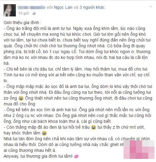 Em dâu đăng tải status hết lời khen gợi Ngọc Lan như chị gái.