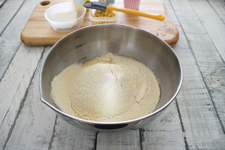 Đập trứng vào âu, thêm sữa tươi vào đánh tan. Rây bột mì, bột ngô vào âu một âu khác, thêm muối, đường, bột nở rồi dùng phới lồng trộn đều. Sau đó đổ bột vào âu trứng sữa.