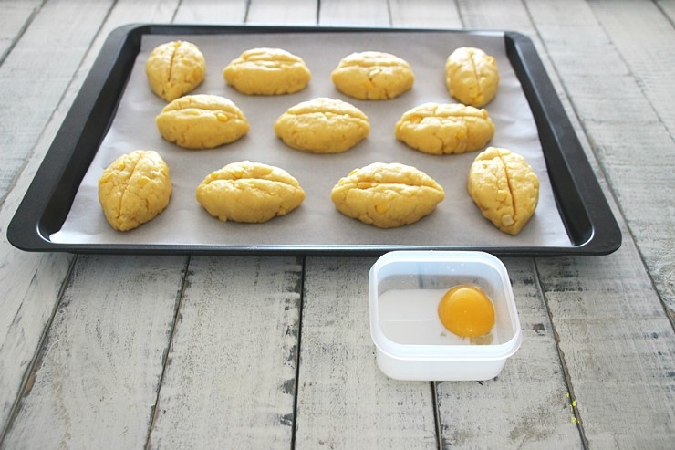 Chia bột thành 11 viên bằng nhau, nắn từng viên bột thành hình bầu dục rồi ấn dẹt. Cho bánh vào khay nướng, dùng dao rạch một đường dọc bánh. Đánh tan lòng đỏ trứng với một ít sữa tươi rồi dùng cọ quét lên trên mặt bánh.