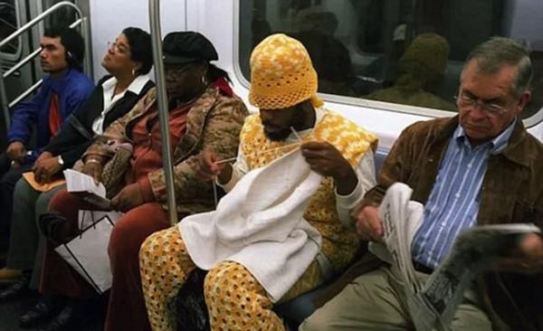 Hành khách này đang mải may vá trên tàu điện ở New York, Mỹ.