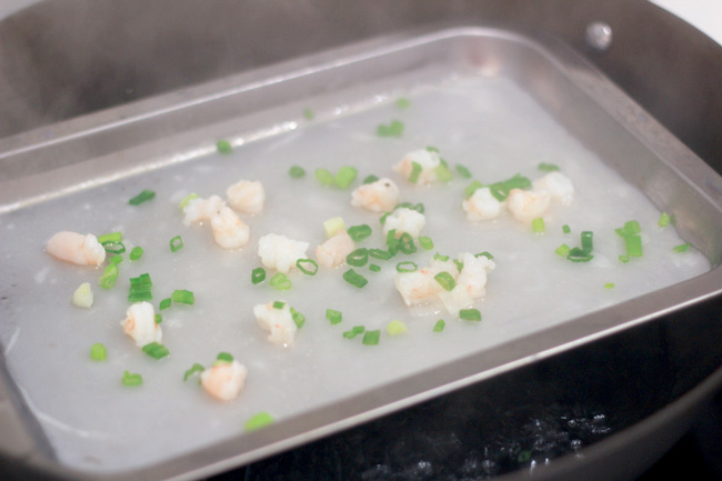 - Hấp trong 1 phút tới khi bánh định hình thì rắc nhân tôm lên hấp thêm 2 phút nữa.