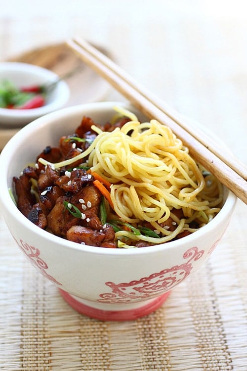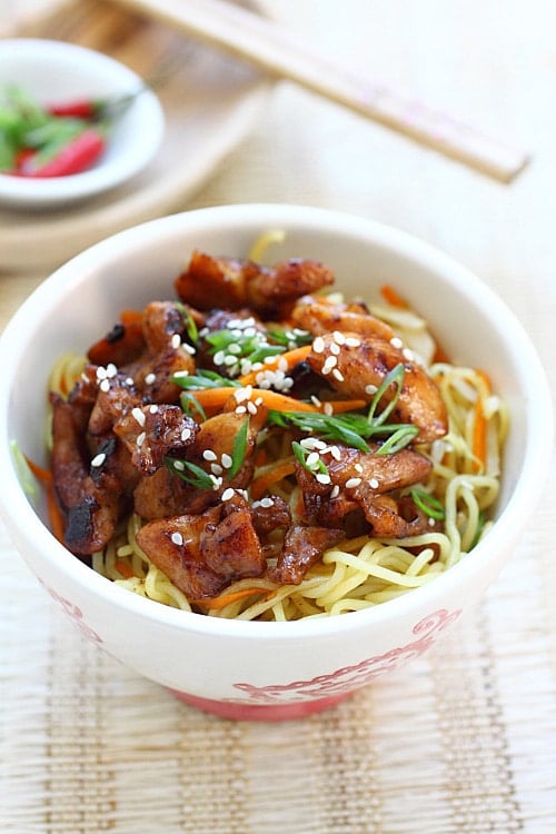 - Bày thịt gà lên trên mỳ, thêm hạt mè và hành lá rồi thưởng thức.