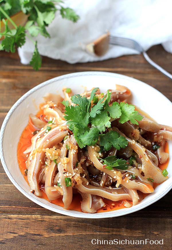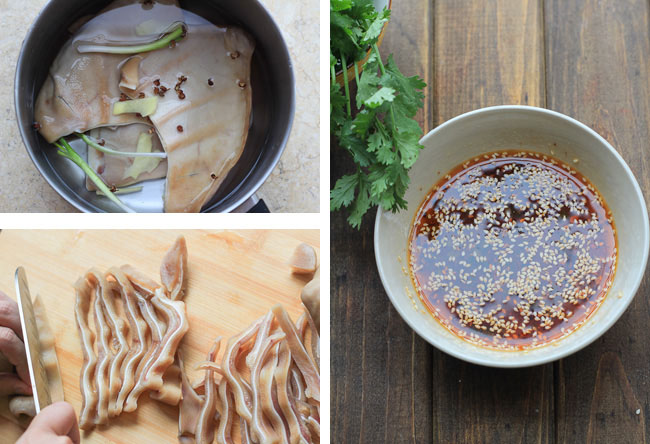 - Vớt tai heo ra để nguội, sau đó thái sợi theo đúng thớ, cho ra đĩa.