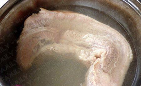Để sôi khoảng 3 phút thì đổ hết nước đó và rửa miếng thịt cho thật sạch rồi nấu lại nồi nước sôi khác và bỏ miếng thịt vào luộc cho đến khi chín. Đợi lúc thịt được luộc chín, bạn nhớ phải cho ngay vào một cái tô lớn đựng đầy nước lọc lạnh - nên để nước lọc vào trong tủ lạnh hoặc cho đá vào để tan với nước, khi làm như thế thịt sẽ không bị khô và thẫm màu.