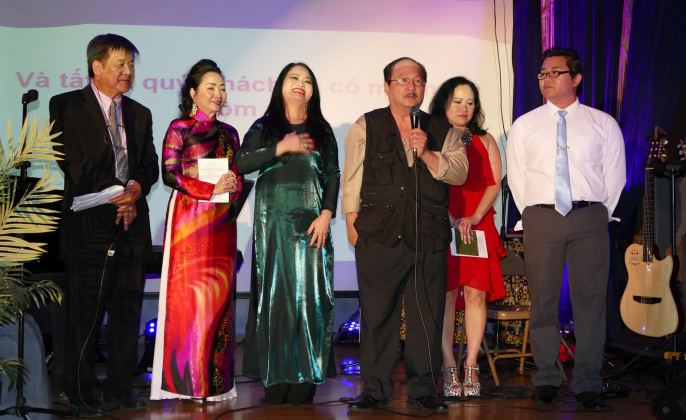 Nhiếp ảnh gia Kiệt Trần (thứ ba từ phải) và Kim Yến (thứ tư từ phải), cùng ban tổ chức nói lời tri ân nhạc sĩ Lam Phương và thính giả. (Hình: Văn Lan/Người Việt)