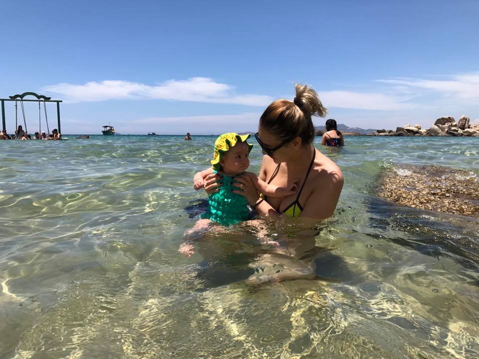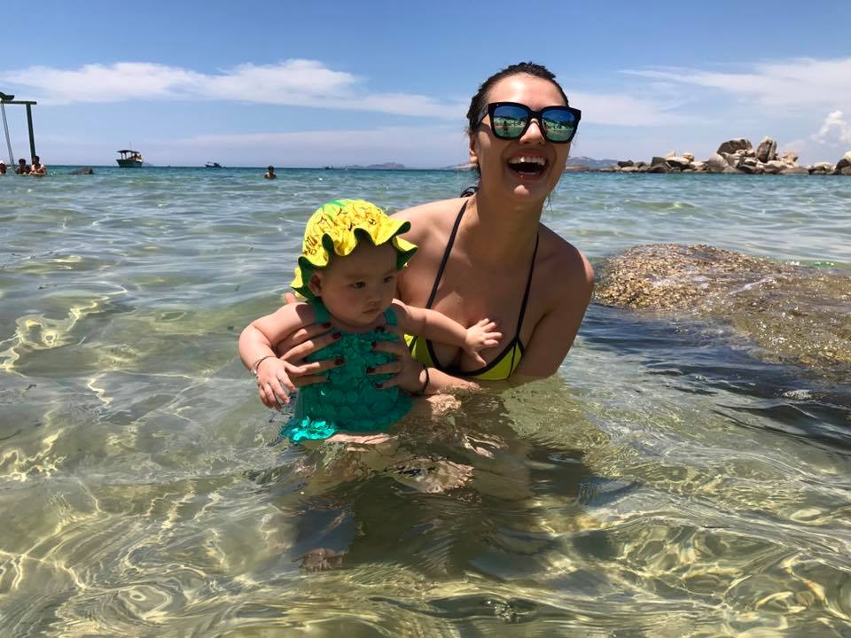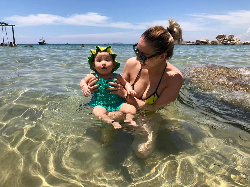 Hồng Quế cho biết, đây là lần đầu tiên Cherry được tắm biển. Cô nhóc 8 tháng tuổi không hề sợ nước mà tỏ ra rất thích thú.