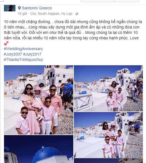 Được biết, đây là chuyến đi kỷ niệm 10 năm ngày cưới của vợ chồng Hà Kiều Anh. Cô hạnh phúc thổ lộ: “10 năm một chặng đường... chưa đủ dài nhưng cũng không hề ngắn chúng ta ở bên nhau... cùng nhau xây dựng một gia đình ấm cúng và có những đứa con thật tuyệt vời. Đối với em như thế là quá đủ. Mong chúng ta lại có thêm 10 năm nữa, rồi lại nhiều 10 năm nữa tay trong tay cùng nhau hạnh phúc. Love!”.