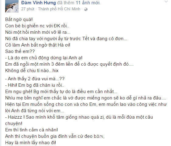 Mặc dù trước truyền thông Hồ Ngọc Hà và Đàm Vĩnh Hưng vẫn coi như không có chuyện gì xảy ra, họ vẫn là một cặp bạn bè thân thiết. Thế nhưng ẩn chứa bên trong khiến người ta thật khó hiểu sau hành động huỷ kết bạn của Hà Hồ. Trước những phát ngôn mà ca sĩ Đàm Vĩnh Hưng tiết lộ về chuyện tình cảm của mình.