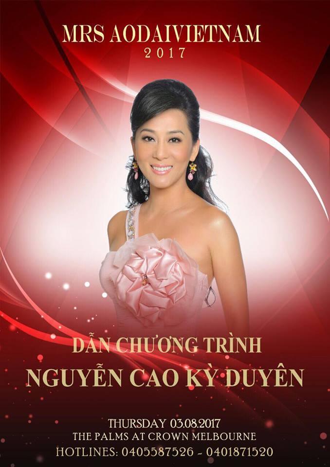 VBF-Năm nay MC Kỳ Duyên làm MC cho chương trình Mrs Áo Dài Việt Nam 2017 diễn ra tại Melbourne. Ngoài ra các ca sĩ tham gia có Hồ Ngọc Hà, Noo Phước Thịnh. Ngoài ra còn có rất nhiều nghệ sĩ tên tuổi cũng tham gia góp mặt cho chương trình như Giáng My, Phan Anh, Ngọc Trinh...